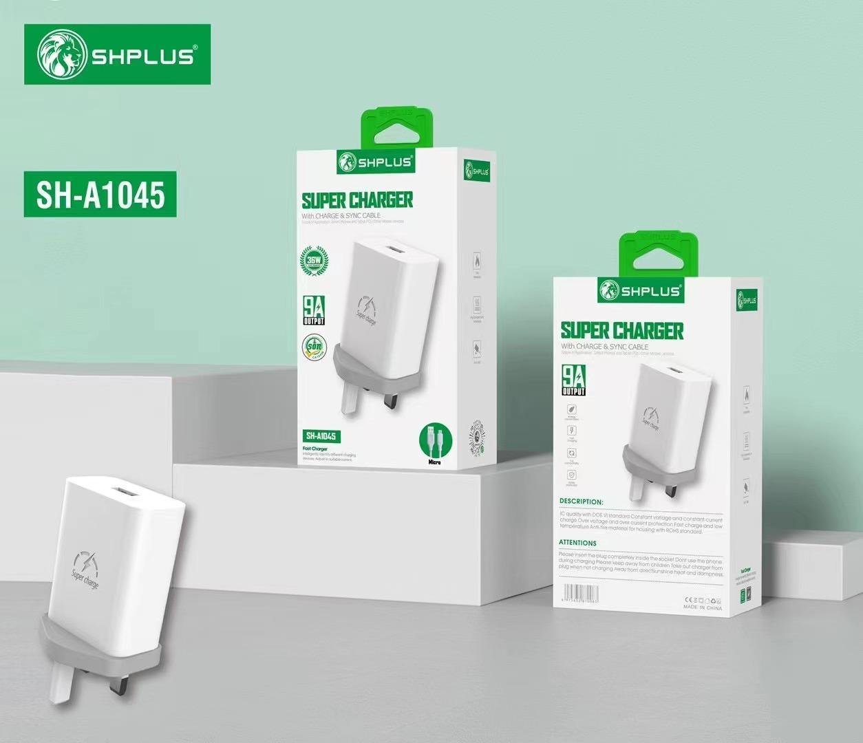 The Shplus Super Charger A1045 is a high-performance charging device designed to deliver fast charging capabilities for a variety of electronic devices. It is often used for smartphones, tablets, and other portable devices, offering advanced charging technology to ensure efficient power delivery.