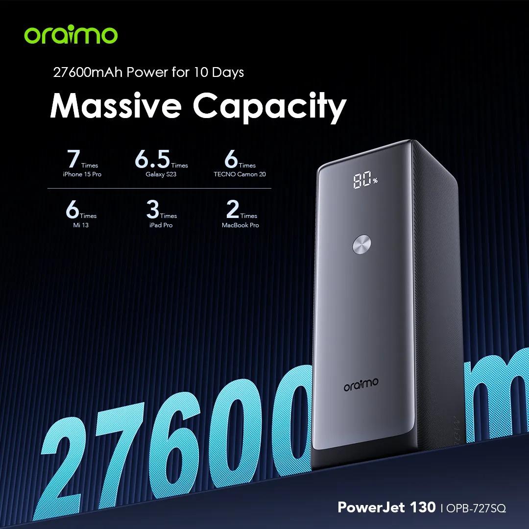 The Oraimo PowerJet 130(model OPB-727SQ) is a high-capacity power bank designed for users needing to charge multiple devices, including laptops, smartphones, and tablets, simultaneously.