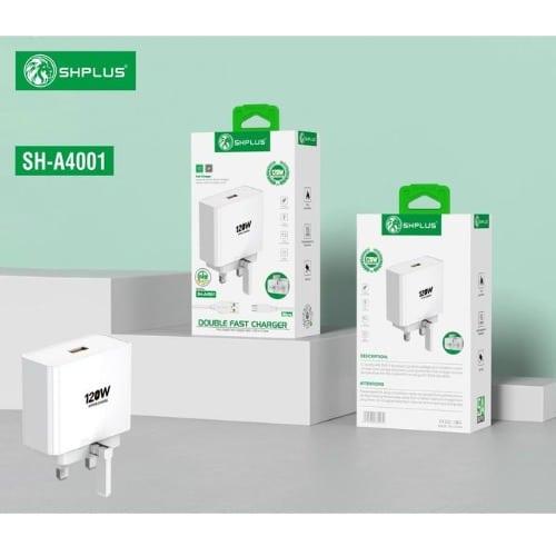 The  Shplus SH-A4001 Charger is a high-performance, 120W fast charging adapter designed to quickly charge multiple devices. It features a compact and durable design, making it ideal for both home and travel use. With its multi-port capability, the charger supports a wide range of devices, including smartphones, tablets, and laptops, delivering efficient power with fast-charging technology.
